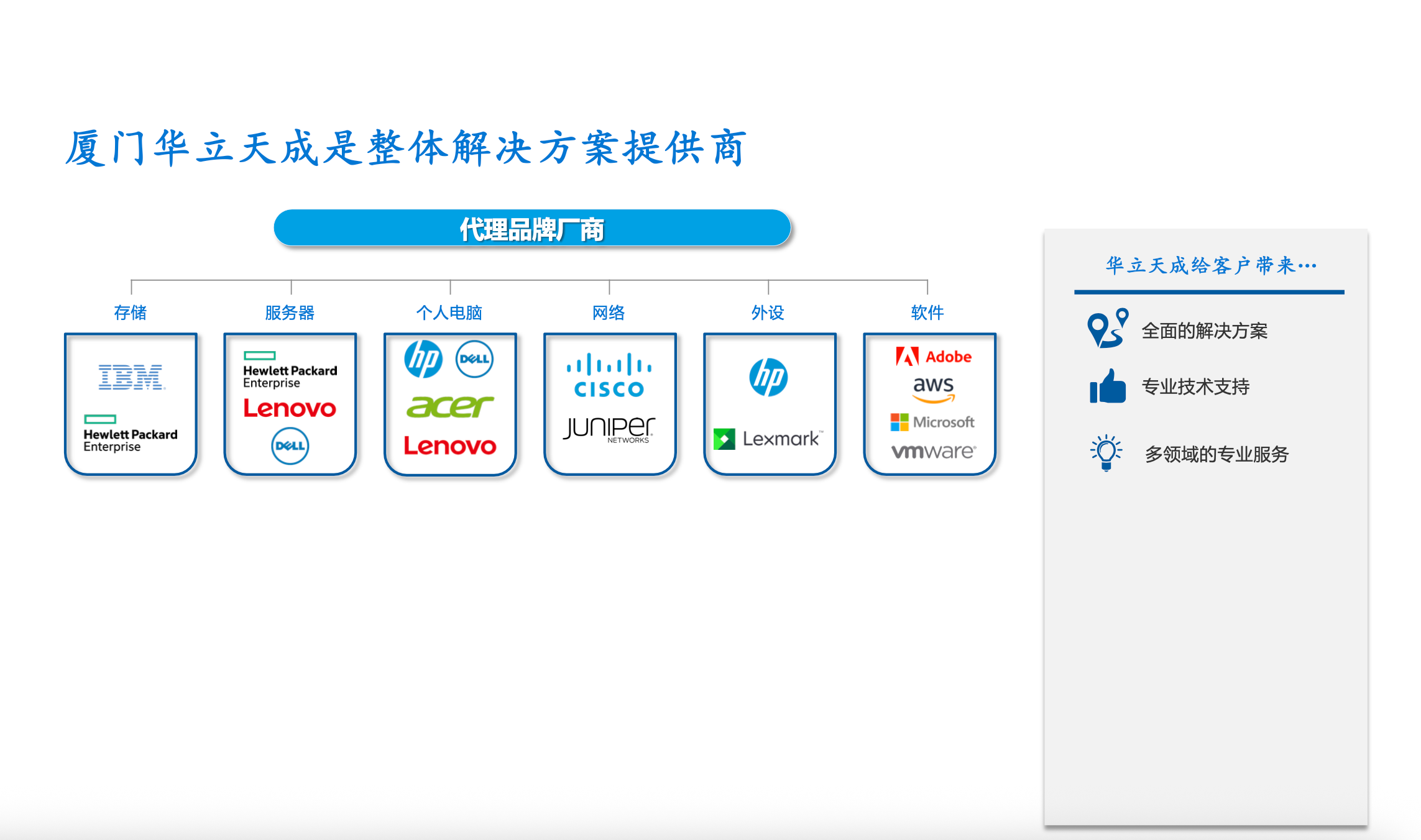 厦门华立天成信息科技有限公司是一家集信息化技术咨询,信息化规划设计,信息系统集成、 系统运维服务、 信息化成果展示为一体的综合性解决方案提供商, 业务主要涉及数据中心信息化建设,网络安全体系建设, 信息系统运维服务等领域。 厦门华立天成信息科技决策层非常重视技术储备,现有员工10余人,其中,50%为技术性人员, 核心技术力量均是行业主流厂商从业10 年以上的实战型高级技术人才。公司在服务客户中,秉承“创新发展、服务至上” 的经营理念,让-客户真正感受到 “合作诚信、服务用心” 的做好态度。 在对外合作中, 倡导“抱团发...